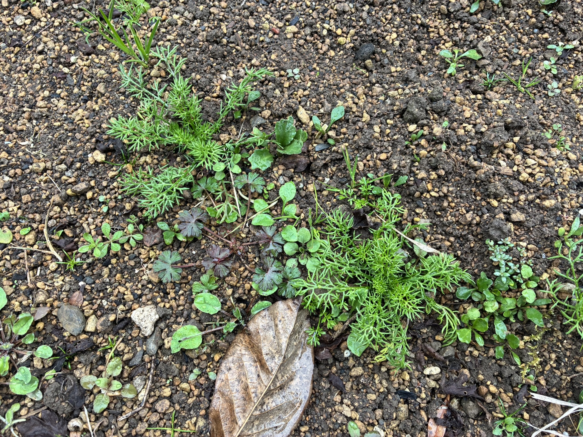 寒い中を外に出て、庭や畑を見て回る。種をまいておいたノースポールにつぼみがついていた。カモミールもこぼれ種から芽を出している。蝋梅は花盛り。万両が真っ赤な実をつけていた。