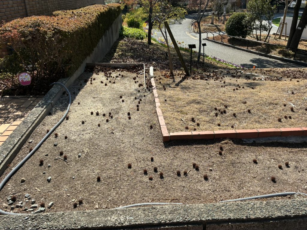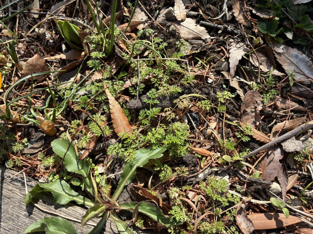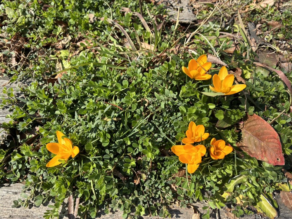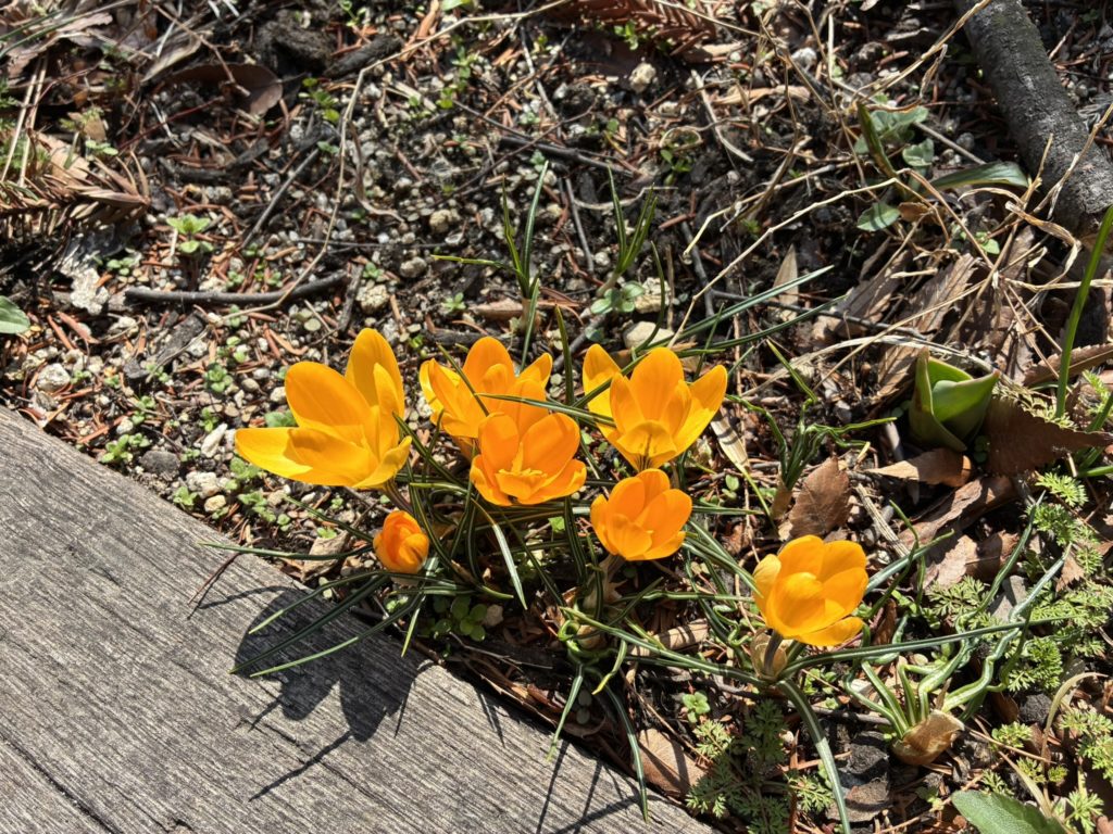 クロッカスかわい~って見てたら名前が分からないけどとげとげしてて草むしりの時に指先に刺さる雑草が生えてた