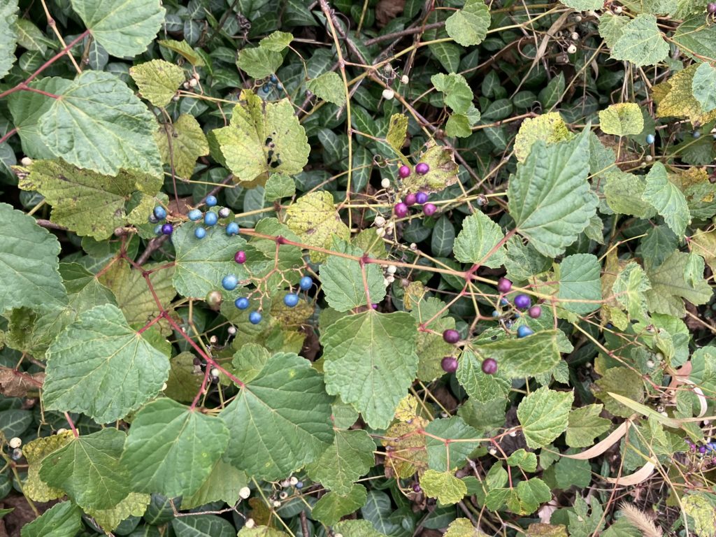 病院から歩いて帰る途中、野葡萄の実がいっぱい生っている草むらを見つけてテンションが上がった。近くに生えているオドリコソウに毛虫がついているんじゃないかと怯えながらも、とびきりたくさん実がついている蔓をちぎって持ち帰った。青や水色、紫の宝石みたいな実がとても美しい。こんなおもしろい植物が野草として道端に生えているなんて最高だ。気分が上がって普段の通院時とは違う道を通ってみたら、実家からどんどん離れて行ってしまう一本道に入り込んでしまい、かといって来た道を戻るのもつまらない気がしてひたすら歩いた。とはいえ、野葡萄の実を手にぶら下げて川沿いを歩くのはなんだか愉快だった。ガガイモの花が咲いていた。