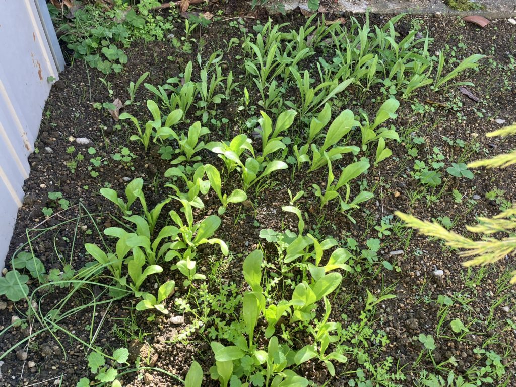 畑に焼肉レタス(チマサンチュ)の小さな芽がいっぱい出ている。面倒くさくて間引きはしていない。金木犀の花も完全に開いた。庭にどんぐりが落ちている。勝手に生えてきたでかいヤツデの葉っぱが、天狗の団扇のよう。